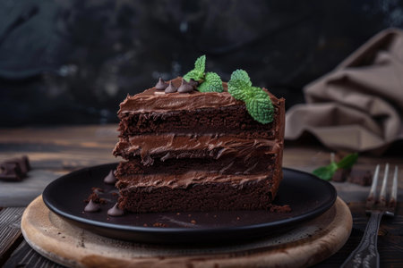 Rich, moist slice of chocolate layer cake garnished with mint on a dark plate