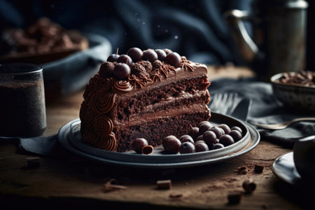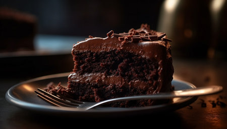 A decadent slice of homemade chocolate cake on rustic plate generated by artificial intelligence