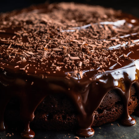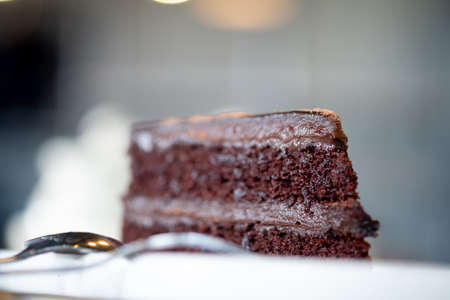Dark chocolate cake with chocolate chips, close-up, selective focus.