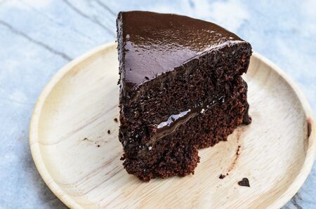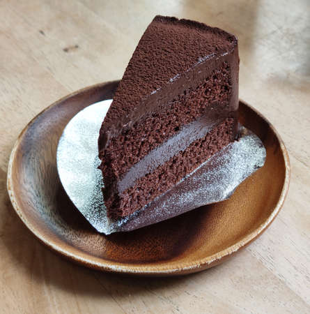 Triangle slices of delicious dark chocolate cake served on wooden dish