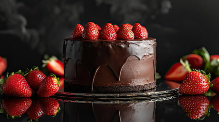 This stunning image showcases a rich chocolate cake adorned with fresh strawberries, set against a glossy black backdrop, perfect for dessert lovers.