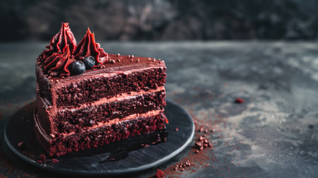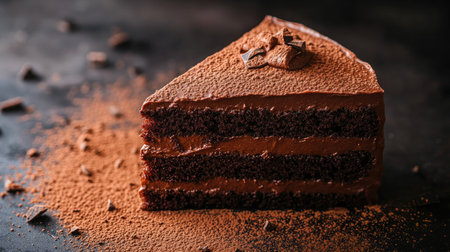 Decadent chocolate cake slice with rich frosting, sprinkled with cocoa powder, close-up, soft lighting