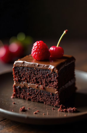 Slice of rich, moist chocolate cake, layered with chocolate frosting and decorated with fresh raspberries and a cherry, served on a rustic plate