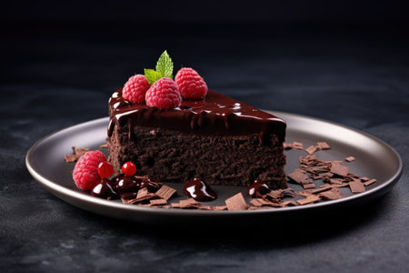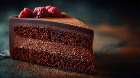 Decadent Chocolate Cake Slice with Raspberries and Cocoa Powder Dusting for Dessert