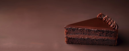 Slice of rich chocolate cake with creamy frosting, set on light brown background