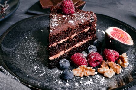 Chocolate sponge cake with cream and forest berries. Chocolate dessert.