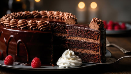 A close-up showcases a decadent chocolate cake, richly frosted and sliced to reveal layers. The dark brown cake contrasts with white whipped cream and vibrant red raspberries. Soft lighting suggests an indoor setting, suitable for dessert advertisements or culinary presentations.