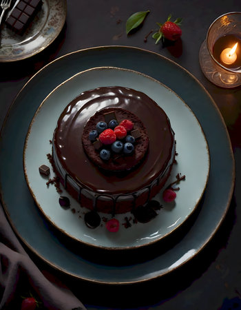 Dark chocolate dessert on a plate, a sweet indulgence ready to eat generated by artificial intelligence