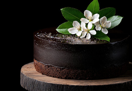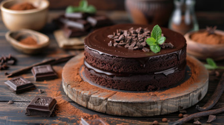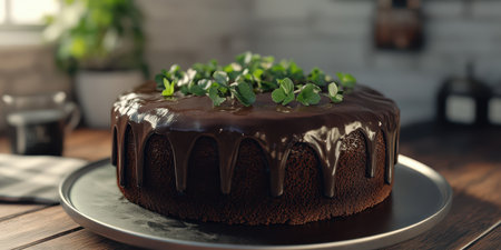 Decadent chocolate cake with rich glaze and fresh herbs displayed on wooden table in a cozy kitchen setting