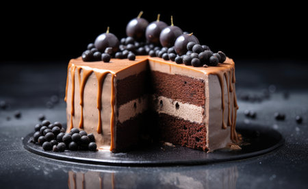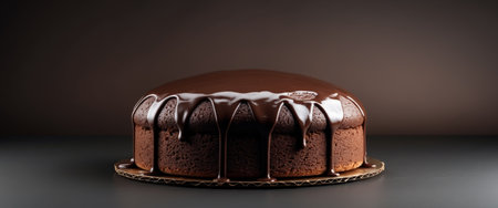 AI Generated. Round chocolate sponge cake covered with chocolate glaze on a dark background