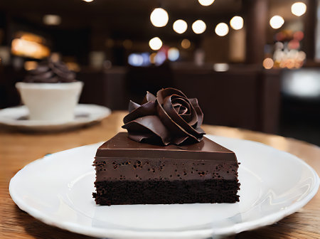 Realistic chocolate dessert in cozy restaurant ambiance with warm lighting neutral colors and intricate detailing to create a closeup inviting atmosphere. Generative AI Generated