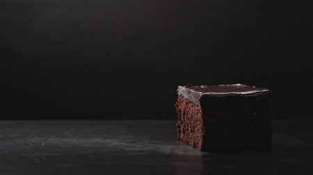 A rich slice of dark chocolate cake with a smooth layer of glossy ganache on top, set against a moody dark background. The cake is presented in a minimalist style, emphasizing its decadent texture and intense flavour.