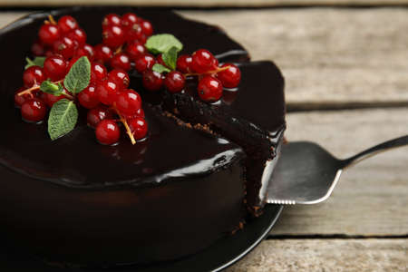 Chocolate cake with chocolate glaze on wooden table, selective focus