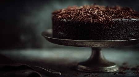 A decadent, dark chocolate cake stands on a vintage silver pedestal stand. The cake is covered in rich, glossy chocolate frosting and topped with delicate chocolate shavings.