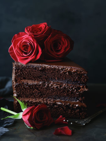 Rich and moist chocolate layer cake elegantly topped with a bouquet of fresh red roses, symbolizing a luxurious and romantic dessert experience.