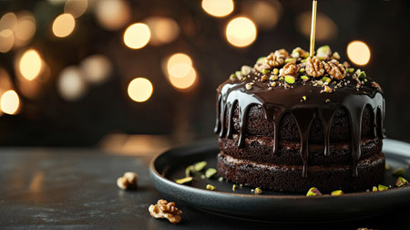 Decadent chocolate cake with glossy ganache, sprinkled with walnuts and pistachios, placed on a rustic ceramic plate with soft lighting.