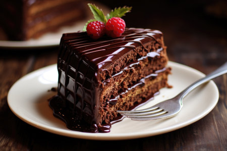 Decadent chocolate cake slice with fresh raspberries on white plate