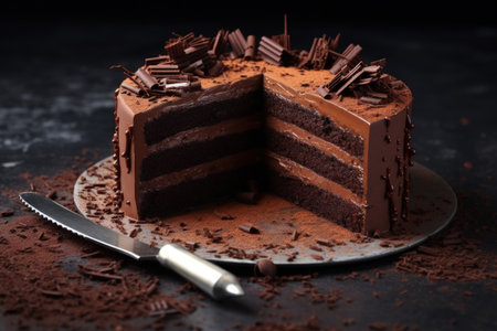 Vertical photo of a chocolate cake and a slice on a plate next to some pieces of c, generative AI