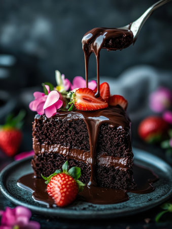A close look at a luscious slice of chocolate cake topped with vibrant strawberries and delicate flowers. The decadent chocolate drizzles create an inviting presentation, perfect for dessert lovers.