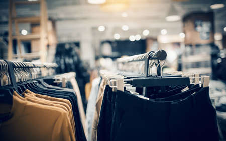 Shopping in store. Clothes on hangers in shop for sale. Blur background. Fashionable clothes in a boutique. Various clothing on market.