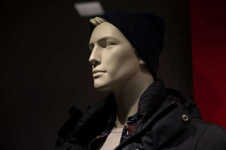 Mannequin in hat. headdress on head. Stylish clothing. fashion today. Mannequin Store.