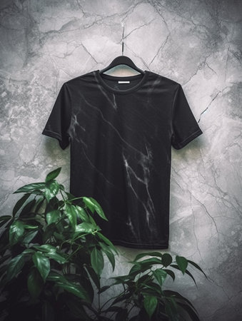 Black t-shirt mockup on wooden hanger with plant on concrete background