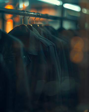 A collection of dark clothing hanging on a rack in a softly lit environment.