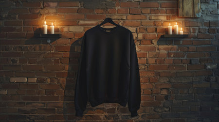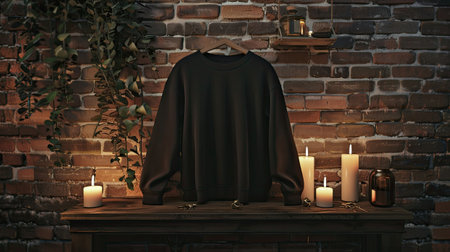 a simple black sweatshirt, casually draped without ties, juxtaposed against burning candles casting a warm glow, set against the rustic backdrop of a brick wall
