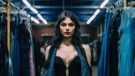 Pensive curly young female model holding hangers with different dresses and trying to choose Thoughtfully brunette girl in black attire posing during shopping in boutique : Generative AI