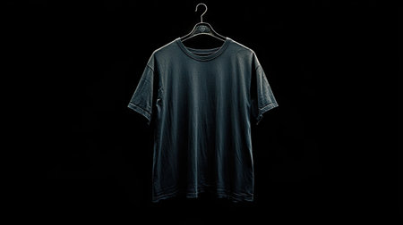 A blank navy t-shirt hanging on a metal hanger against a black background, showcasing the simple design and rich fabric color. --chaos
