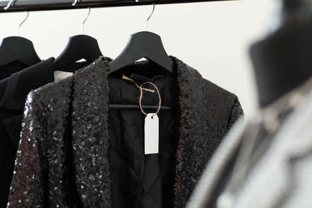 Clothes on hangers with blank paper label