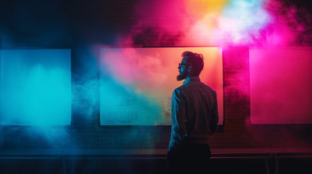 Man stands in front of a wall with three screens, one of which is lit up with a colorful smoke. The man is wearing glasses and he is looking at the screens. Concept of technology and innovation