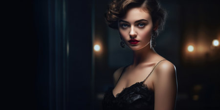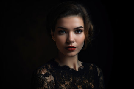 Portrait of a stunning woman with peach-colored lips, wearing a black lace dress against a dark background