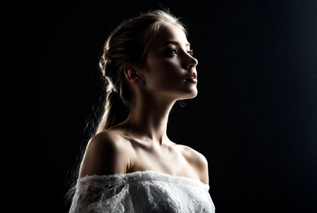 Perfect teenager girl in doll image posing in shadow at black background, frozen looking away. Portrait of lovely teen lady in white, dark studio shot. Beauty body care concept. Copy ad text space