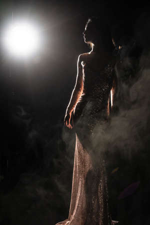Silhouette of a slim, artistic girl wearing an elegant evening dress in theatrical fog. Sensual, conceptual and fashionable design. Copy space.
