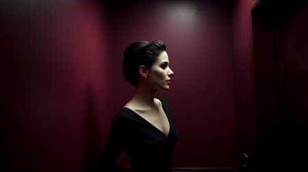 A woman stands in a hallway with dark red walls. She looks to the side, lost in thought. The setting is near an elevator. The light is soft and warm around her.
