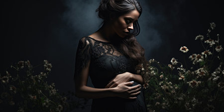 Sad Pregnant woman on a black background. Black flowers. High quality photo. Generative AI
