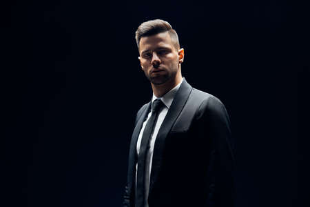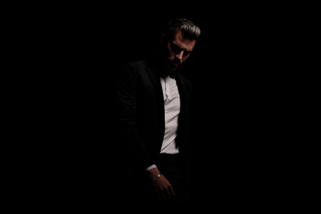 mysterious businessman in black velvet tuxedo looking down, holding hand in a fashion pose and posing on black background in studio