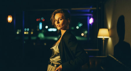 A stylish woman in a dark setting, wearing a satin top and blazer, with soft lighting and a blurred city background