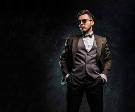 A stylish young man in sunglasses dressed in an elegant suit posing with a hand in a pocket against a dark textured wall