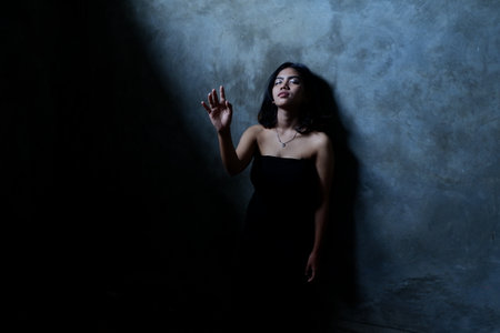 Portrait of a beautiful asian woman in black dress posing in dark room