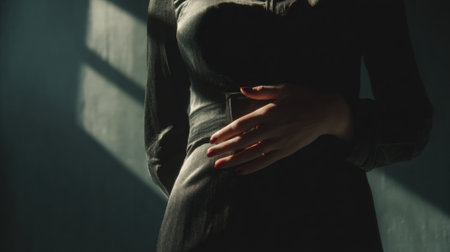 Woman hiding smartphone behind back in dark room with dramatic lighting