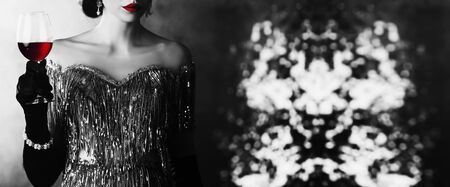 old fashioned photo grain added for 20s style. Mysterious sexy silhouette retro woman with red lips, glass of wine in hand. Black and white. shiny vintage dress. Silver backdrop free space for text