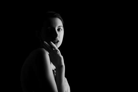 sensual girl on black background with copy space looking at the camera covering her naked body, monochrome