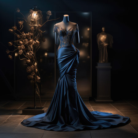 Elegance unveiled: a captivating display of a beautiful, luxurious evening gown gracefully adorning a mannequin, epitomizing timeless style and opulence for a glamorous and chic affair.