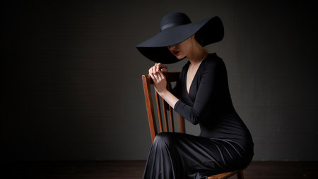 Stylish female figure in a black dress and hat, seated on wooden chair, exuding elegance and mystery in a softly illuminated studio space