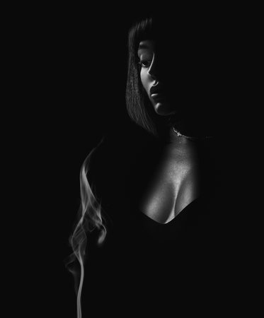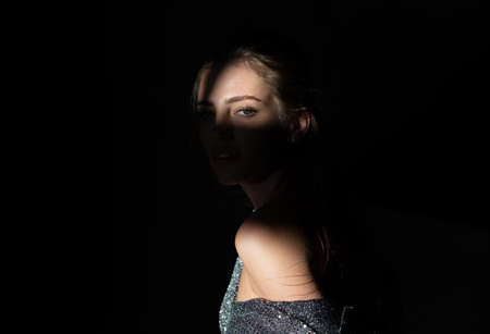 Sensual woman with shadows on beautiful face. Shadow on girls face, charming attractive female model.