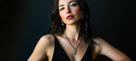 An elegant woman poses confidently in a black dress and beautiful jewelry