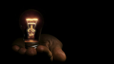 incandescent light bulb in a hand on black background