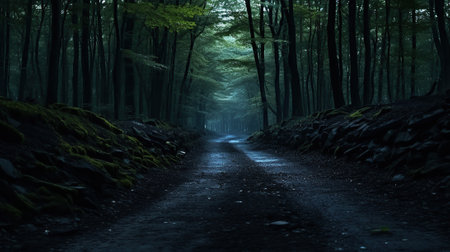 Mysterious dark forest road with light coming through the trees.